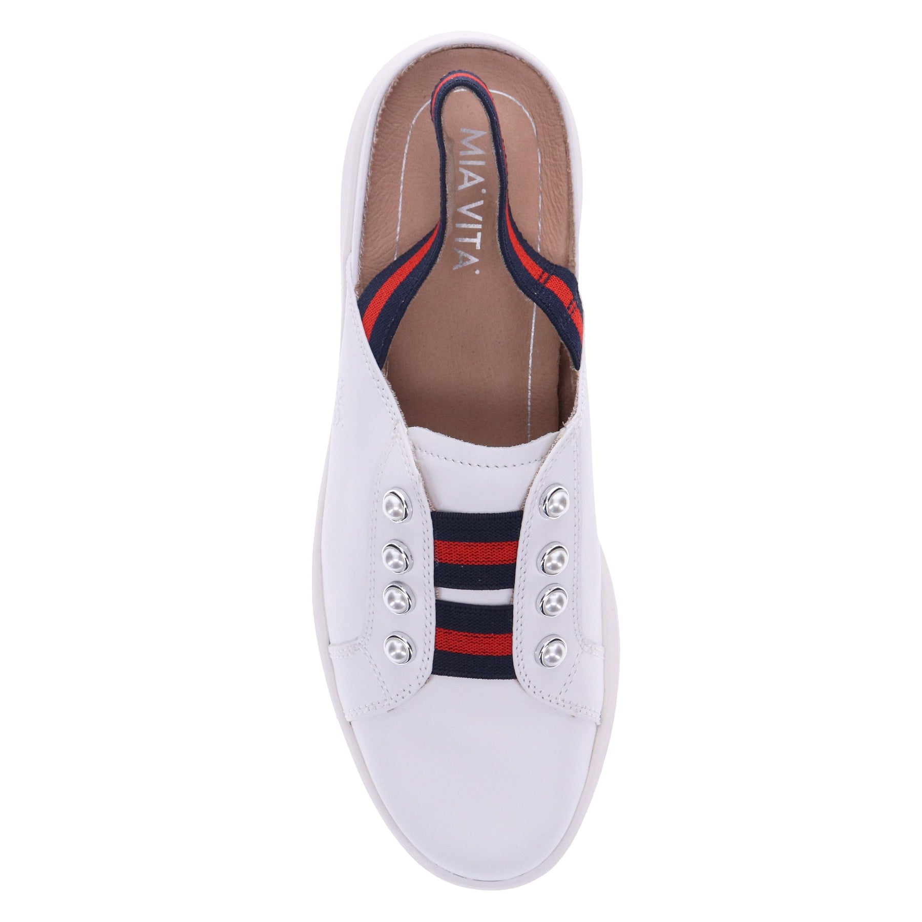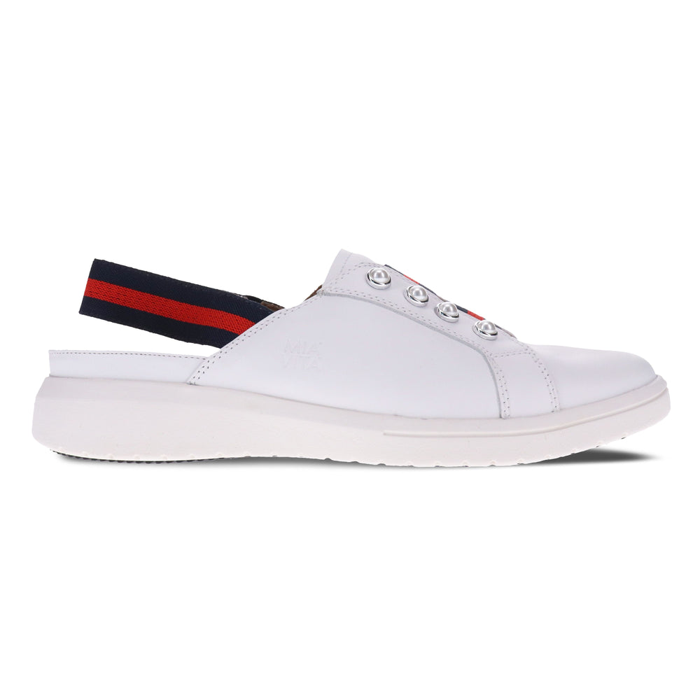 Bugsy Slip On Style Gives You The Ease Of Fit With Its Two Tone Triple Elastic Detail And Pearl Embellishments To Keep You Interested. This Will Soon Become Your Go Anywhere Shoe. Underfoot The Removable Mia Vita Supportive Footbed Is Specially Moulded To Give You All The Comfort You Desire, The 3 Layers Of Underfoot Padding Gives You Support Where You Need It Most. The Outsole Is Super Light Weight It Has A Rubber Piece Through The Bottom Of The Sole To Ensure You Get Durability And Comfort.
